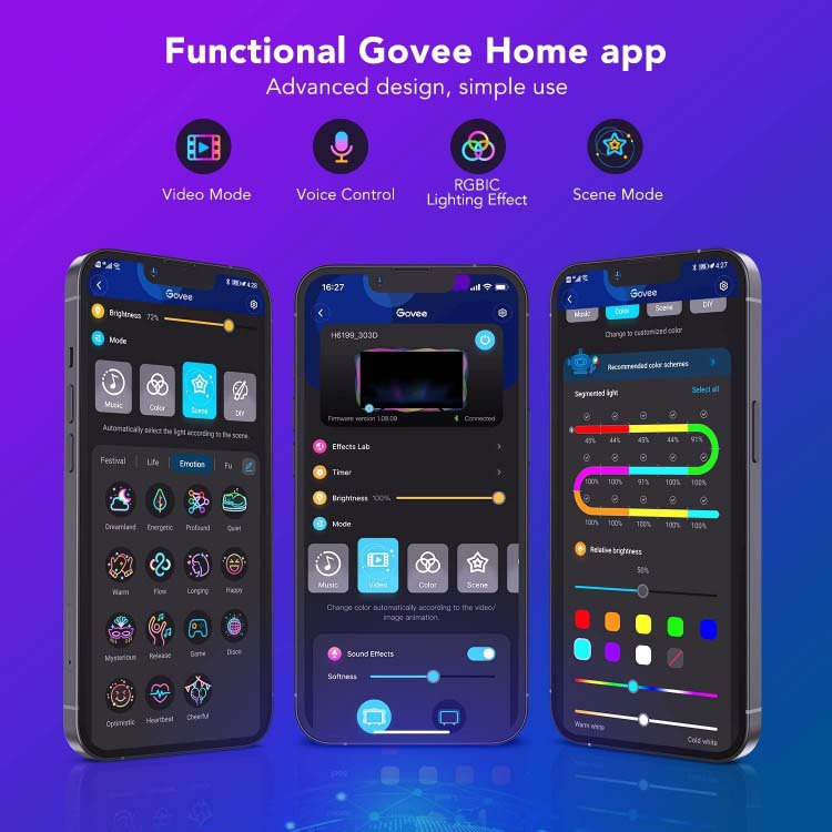 کنترل صوتی هوشمند: چراغ های LED خود را برای تلویزیون با دستورات صوتی ساده ، از طریق Alexa و Google Assistant یا با برنامه Home Govee مدیریت کنید. از دسترسی به رنگ ها و ویژگی های بیشتری مانند تایمر ، فیلم ، DIY و حالت موسیقی لذت ببرید و به شما در ایجاد محیط مورد نیاز خود کمک می کند.