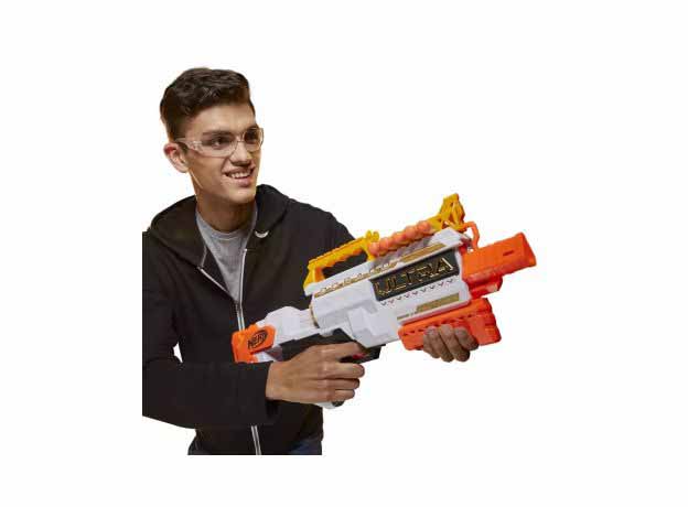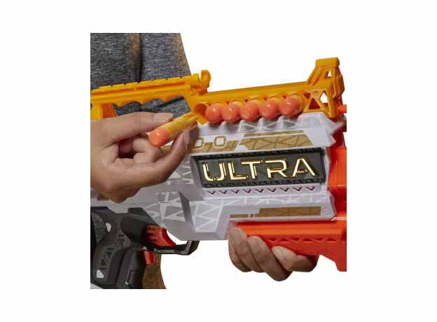 سری Ultra از تفنگهای نرف که جدیداً به بازار عرضه شده است بیشترین برد پرتاب تیر را در بین محصولات این برند دارد. تفنگ Nerf Ultra Dorado از این سریِ جدید، دارای خشاب چرخشی است و 6 تیر را در خشاب خود جای میدهد. برای شلیک با قدرتمندترین تفنگ نرف فقط کافیست که تیر را درون خشاب بگذارید، هدفگیری کنید، دکمهی زیر ماشه را نگه دارید و بعد ماشه را فشار دهید. با هر بار شلیک شما تنها یک تیر پرتاب میشود که تا حدود 36 متر برد دارد. روی بدنهی تفنگ نیز 6 جای تیر برای نگهداری تیرهای اضافه تعبیه شده است.
