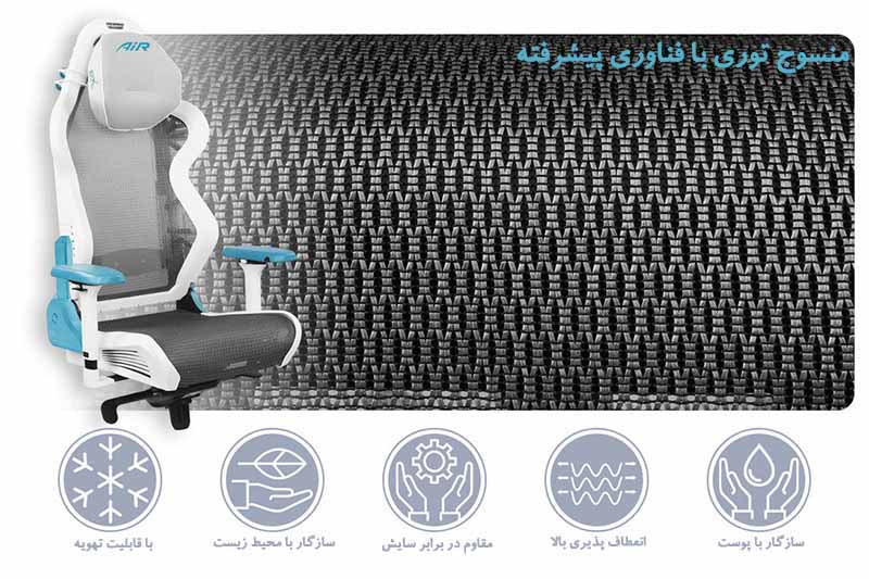 از مهمترین ویژگیهایی که این صندلی جذاب دارد میتوان به روکش آن اشاره کرد. روکش این صندلی گیمینگ حالت توری دارد و از این رو بهخوبی از تعریق بدن گیمر پس از چند ساعت نشستن روی صندلی جلوگیری میکند. این توری به بهترین شکل باعث تقویت جریان هوا شده و از تجمیع گرما در پشت گیمر جلوگیری میکند. خوشبختانه این توری کاملاً با پوست انسان سازگاری دارد و همچنین ضد آب است.