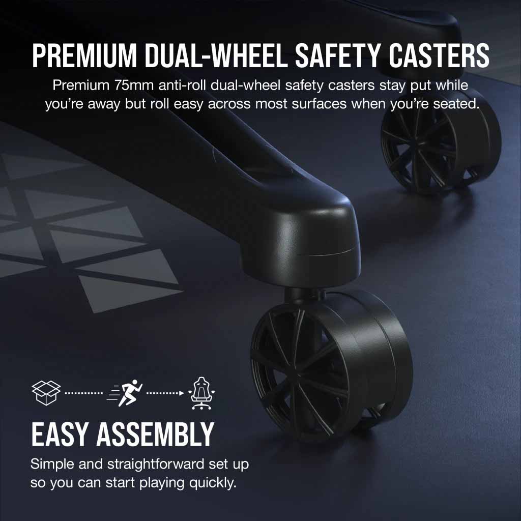 چرخهای صندلی بهصورت دوگانه یا Dual ساخته شدهاند و هرکدامشان 75 میلیمتر است. این چرخها ضمن اینکه بهصورت ضدلغزش طراحی شدهاند و ثبات صندلی هنگام نشستن روی آن را تأمین میکنند، بهراحتی روی اکثر سطوح حرکت میکنند و شما میتوانید بدون نیاز به واردآوردن فشار زیاد، بهراحتی صندلی را روی سطح حرکت دهید و جابهجا شوید.