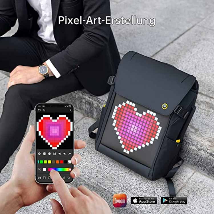 کیف Divoom سایز کوچک، یک کوله پشتی مناسب همه با یک نمایشگر LED است که با استفاده از اپلیکیشن Divoom میتوانید تصویر آن را تغییر دهید یا حتی یک گیف روی آن به نمایش بگذارید. نمایشگر LED این کوله پشتی حتی میتواند به عنوان یک ساعت کار کند و از مینی گیمهای اپلیکیشن Divoom نیز پشتیبانی میکند. اگر ریموت کنترل مخصوص این کوله پشتی را داشته باشید، میتوانید به راحتی هنگام دوچرخه سواری یا موتورسواری، جهت حرکت و پیچیدن خود را روی کوله پشتی به نمایش بگذارید.